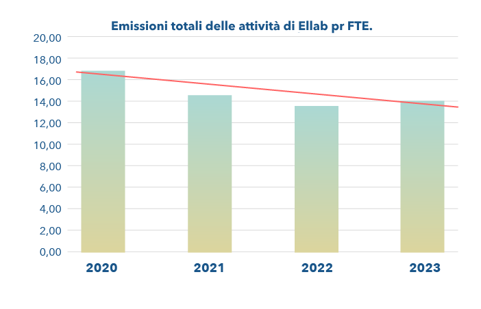 Le emissioni totali delle attività di Ellab per ETP hanno raggiunto il minimo storico di 13,9 (tCO2e), rispetto alle 17,3 del 2020. Ciò rappresenta una sorprendente diminuzione del 20% delle emissioni per dipendente, nonostante un aumento del 105% del numero di dipendenti.