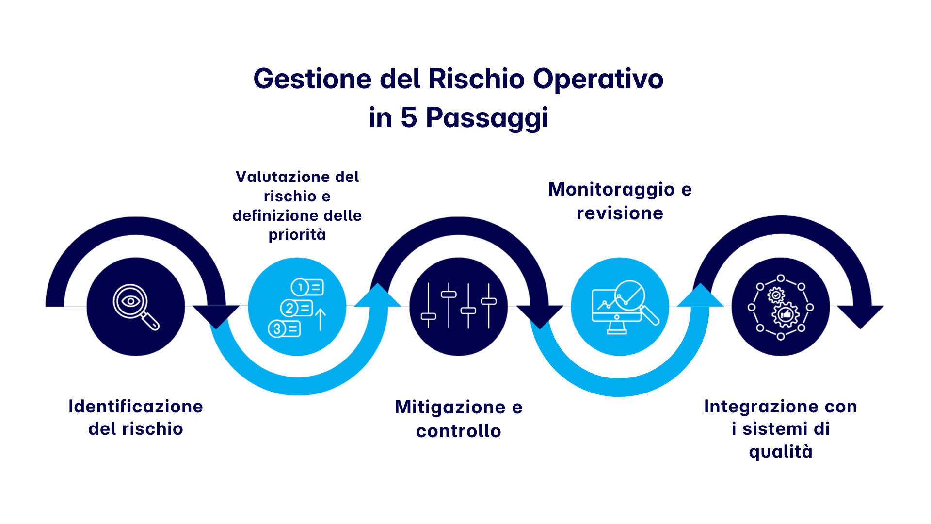 In sostanza, la gestione del rischio operativo è il processo di identificazione, valutazione, monitoraggio e mitigazione dei rischi derivanti dalle operazioni quotidiane. Nella conformità alle normative in ambito life science, questi rischi possono includere: